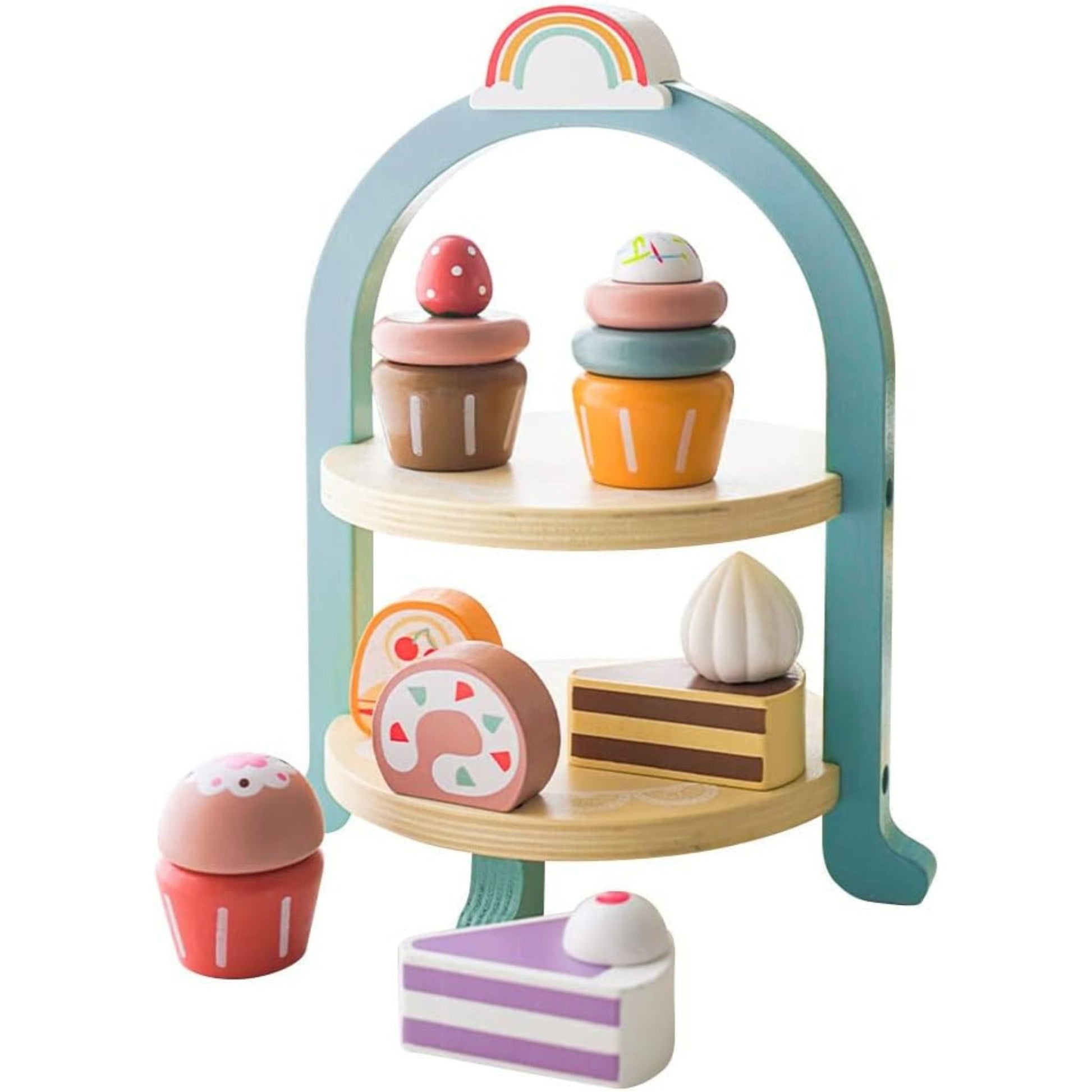 • Charming & Realistic Design: A two-tiered stand filled with wooden treats, from cupcakes to mini pastries, all painted in inviting colors that capture children’s attention and make playtime extra special.