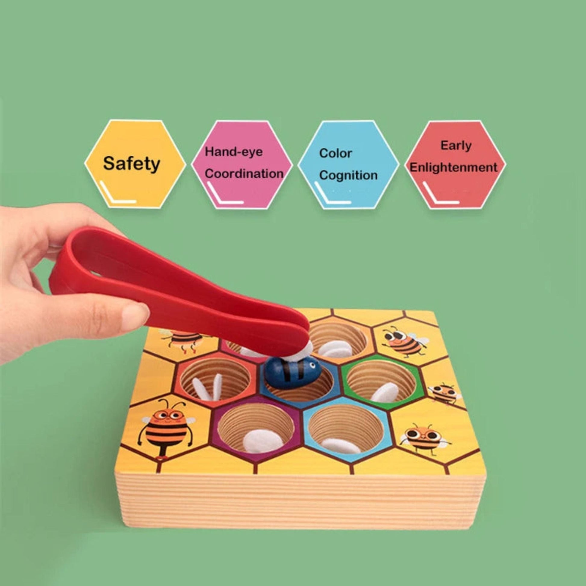 • Tweezer Tongs: Accompanied by a pair of tweezer tongs perfectly sized for little hands, this toy enhances fine motor skills and hand-eye coordination as children pick up and place bees into their corresponding slots.